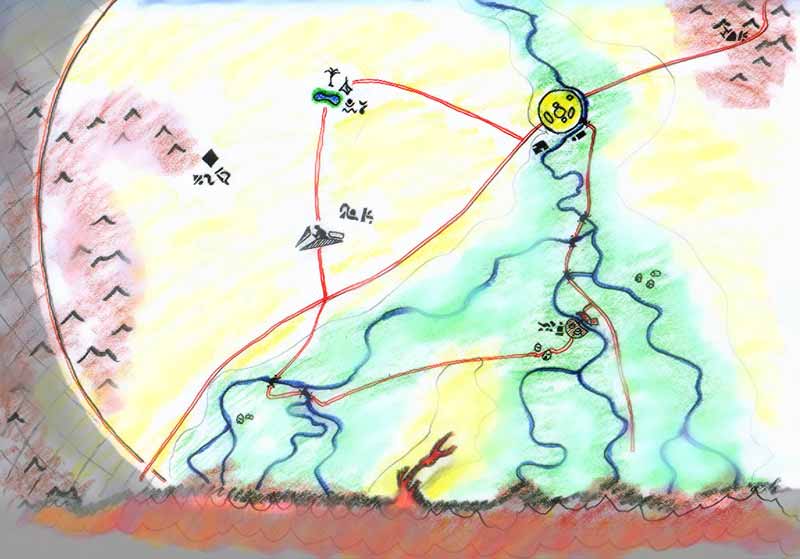D ie Gruppe wagte noch am Abend einen Vorstoß und flog über die Wüste Richtung eines kleinen Dorfes im nahen fruchtbaren Gebiet. Die Dörfler sahen die fliegende Gruppe im Dämmerlicht und beteten sie sofort eifrigst an. Wie Götter wurden sie aufgenommen, wobei der Symbiont manche Gesprächsfetzen übersetzte. Lorz versuchte, die Dörfler davon zu überzeugen, daß sie keine Götter seien, was sie sehr verwirrte. Man dachte, die Gruppe seien irgendwelche unbekannten Götter, die ihnen gegen eine schlimme Plage, die Skors, helfen wolle. Die Skors seien das Böse, und es habe sie erwählt, weil sie wohl wenig Abgaben an die Pharaonin zahlten, die Ernte sei so schlecht. Einige Tiere und ein Mann seien schon getötet worden. Zur Gruppe sprach stets eine aufgeweckte Dörflerin, welche auch die Anführerin darstellte. Sie erzählte einiges über OHN: Die Frauen würden herrschen, an der Spitze stünden die Göttinnen und die Pharaonin. Solche wie X’Lerul seien als Sklaven bekannt, natürlich könnten sich nur Reiche Sklaven leisten. Und es sei vielleicht nicht gut für die Gruppe, nach OHN direkt zu reisen, da es eine alte Prophezeiung des Orakels gebe, die aus Fremden aus Norden würden OHN den Untergang bringen. Nur unter der Bedingung, die Skors zu bekämpfen, konnte die Gruppe die Dörfler davon überzeugen, daß sie selbst nichts böses darstellten. Skors, so erzählten die Dörfler, seien seit Jahrhunderten eine Plage in den Randbezirken Ohns, besonders galt die Mine als betroffen, dort verchwanden immer mal wieder Sklaven auf ungeklärte Weise.