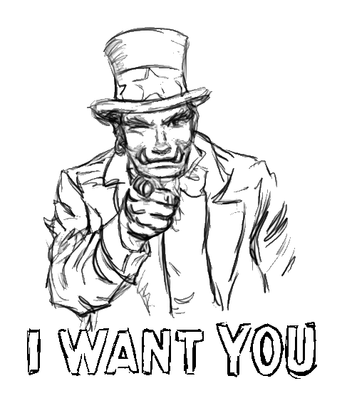 Das erste Bild unserer Zeichnerin: Der gute alte Ak im Oncle Sam-Kostüm. Geil!
