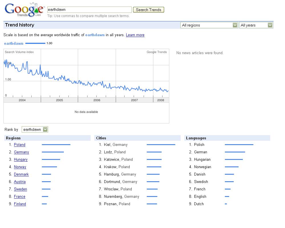 Google bietet jetzt ein Tool namens Google Trends an, damit kann man sehen, wie oft Suchanfragen im Laufe der Zeit gestellt wurden. Interessant für "Earthdawn" - leider nimmt das Interesse über die Jahre ab. Da müssen wir was tun. Aber immerhin: Das deutsche Interesse ist mit am größten. Und die Kieler sind am meisten interessiert, weltweit :-)