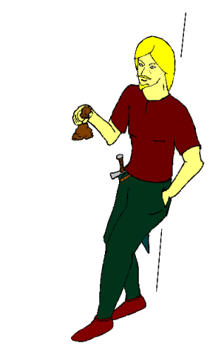 Hmm, wo ich es mir genauer überlege ... ja, der Kerl war mal hier, hab ihn aber schon seit einer Ewigkeit nicht mehr gesehen. Ich glaube er schuldet mir noch Geld.' -- der gleiche Halunke, jetzt um 2 Silberstücke reicher