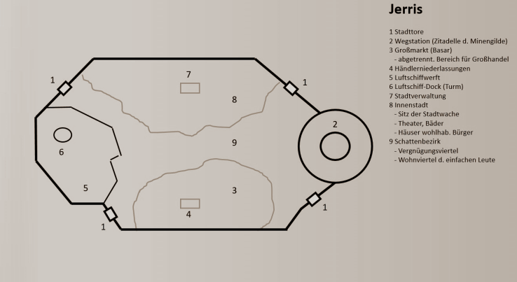 Die reiche aber trostlose Händlerstadt Jerris hat wenig mehr zu bieten als staubige Luft, eine niedergeschlagene Atmosphäre und teilweise extreme Hitze! Allerdings hat der Umstand, dass sie direkt an einer der wichtigsten Handelsrouten Barsaives liegt, diese Stadt und viele ihrer Einwohner sehr reich gemacht. Da allerdings die räumliche Nähe zur Öde und zum Giftwald das Leben in dieser Handelskolonie zu einem recht zweifelhaften Vergnügen macht, halten sich außer den Geschäftemachern auch nur noch wenige andere Bürger hier auf. Ständig ist ein schwarzer Dunst in der Stadt der vielleicht dämonischer Natur ist.