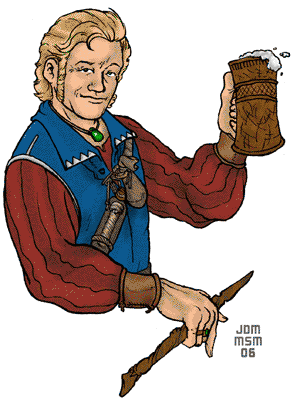 Ich betrachte mich als der Part der Gruppe, der für die Dinge verantwortlich ist, die kein Abenteurer mit Verstand oder dem Wunsch nach einem langen Leben zu tun vermag. (Die Gruppe in lange Kneipenorgien verstricken ist nur ein kleiner Teil davon!) Auch verlasse ich mich oft auf die Redegewandtheit des Troubadours – was allerdings nicht bedeutet, dass ich nicht auch zuschlagen kann, wenn es die Situation erfordert. Falls Ihr mal mit den Schülern des Lebens zu tun bekommt, ein Hinweis am Rande : Finanzielle Vereinbarung trefft Ihr nur mit mir, sonst gehen wir bald am Bettelstock! Immer dieses Gerede von Heldentum und Gemeinnützigkeit. Kann man sich von Heldentum Brot oder Wein kaufen? Ein Schwert reparieren? Eine Rüstung verbessern lassen? Einen Wirt bezahlen? NEIN! Umsonst ist der Tod – ja und auch der kostet schließlich das Leben. Wenn Ihr Almosen wollt, dann geht zur Wohlfahrt, denn wir sind schließlich Profis und die haben Ihren Preis.