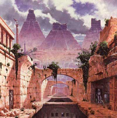 ...Weiße Säulen, so rein wie Wolken, die sich erheben und Torbögen stützen, deren Reliefs alle Herrlichkeiten dieser Welt zeigen...goldgepflasterte Straßen, Streitwagen, die durch die Luft flogen, [große Tempel, die nur von einer einzigen smaragdmosaikverzierten Säule|] gestützt wurden. Prächtige Steine, jeder so reinweis wie von der Sonne gebleichte Knochen, führen aus allen Gegenden Barsaives zur Stadt. J'Role sprach von Gewölben, die mit ganzen Stapeln magischer Artefakte und Schätzen angefüllt waren. Von Bildern, die auf riesige Marmorwände gemalt waren und sich bewegten, wenn sie betrachtet wurden, von Türmen, an denen Schiffe aus Stein anlegten, nachdem sie von weither durch die Luft gesegelt waren.