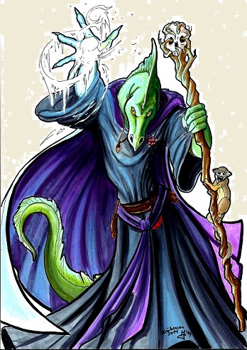 • Relativ neu bei uns ist der T'Skrang Schwertmeister Blanka, welcher ein ausgesprochen großes Interesse an altertümlichen Waffen hegt. Wir fanden ihn vor nicht allzu langer Zeit in einem alten Kaer, wo er nach eben diesen suchte. Und auch wenn ich die Kunst der Magie dem physischen Kampf vorziehe, muss selbst ich anerkennen, dass sein Talent das Schwert im Kampf zu schwingen seinesgleichen sucht.