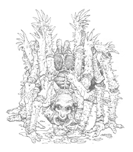 Benjen Flüsterer, seiner Magie zu Tieren und seinem Blute, verdanken wir es alle Wölfe kampflos in die Flucht zu geschlagen zu haben. Erholungstränke helfen auch Pferden. So lautete meine Lektion für diesen Tag, Garlen sei Dank. Ein paar Tage lang führten wir unsere verwundeten Reittiere, bis wir auf eine geplünderte Händler Karawane stießen, alle Namensgeber tot, Getötet von berittenen Orks. Nach einer Feuerbestattung, eines Namensgebers würdig, reisten wir weiter gen Scolberge. Wie auf der Reisekarte richtig vermerkt fanden wir die Höhle, in der zwei Jehutras das Horn von Valere bewachen sollten. Jehutras sind wirklich sehr interessante Kreaturen. Gigantische Spinnen mit dem Kopf eines Menschen, allerdings blickten die Augen seltsam leer drein. Auch schien hier Benjens Magie nicht zu wirken, was darauf schließen lässt dass es sich hierbei nicht um Tiere handelt. Irgendwas Dämonenhaftes müssen sie aber sein, da meine entsprechenden Zauber ein Ziel fanden. An dieser Stelle sei noch erwähnt dass die Metallablagerungen auf der Brust einer Jehutra als Trophäe einiges an Silber wert ist, zumindest bot uns Wosan einen stolzen Preis. Hier nun eine Zeichnung einer Jehutra.
