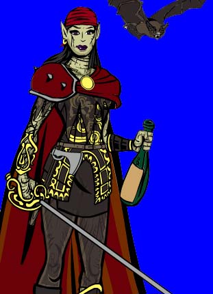Sprachen: Theranisch, Elfisch, Throalisch, Cathai Ausrüstung:schwarze Rüstung Gehärtetes Leder (verziert), Leinenhose, Armschienen, Breitschwert, Wurfdolch, Theranischer Mantel, Weinschlauch