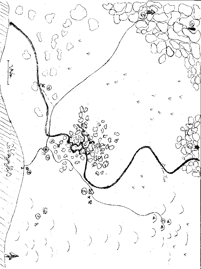 Entfernung: 8 Meilen; Gelegentlich treiben sich in diesem Felsgebiet einige Triplikanten herum. Die beiden Orkwachen trafen zufällig auf zwei Kopien. Einer der Orks wurde Im Kampf getötet, und seine Leiche hier zurückgelassen.