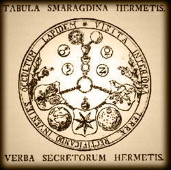 Dieses ist das berühmteste und wichtigste Werk des Alchemismus: Eine Smaragdtafel. Es ist nicht viel Platz auf ihr, und der Text ist kurz und mystisch, doch ist es der Anfang allen Alchemismus. Über den Gründer Hermes Trismegistus ist nicht viel bekannt; zuviele Legenden ranken sich um seine Gestallt, aber allgemein gilt er als Vater des Alchemismus, und manche halten ihn für einen Drachen oder gar eine Passion.