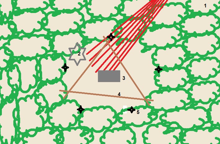Noch einige Minuten warteten wir, bis die ersten Sonnenstrahlen die Mitte der Lichtung erreichten. Der Altar begann sich im roten Sonnenlicht zu manifestieren. Wenig später hörten wir sich etwas nähern, eine der Fallen wurde ausgelöst. Jedoch standen wir nicht dem Feind gegenüber, den wir erwarteten. Eine Monstrosität schlug sich einen Weg durch den Wald und fällte glatt ganze Bäume mit einem Hieb. Eine gut 3 Schritt hohe Abscheulichkeit, recht breit, langsam und ungeschickt, aber stark wie 5 Mann. Die meisten Fallen wurden von ihr einfach überrannt. Da wir dies allerdings nicht vorhersehen konnten, war unser Plan nutzlos, dass sich manche entschieden in ihrem Versteck zu lauern, sollte es sich nur um eine Ablenkung handeln. Die anderen stellten sich der Kreatur, waren aber leicht unterlegen, sodass dann doch nahezu alle einschreiten mussten, um sie zu bezwingen. Nach dem Kampf versorgten wir provisorisch unsere Wunden und warteten noch immer auf den eigentlichen Feind, jedoch erschien er nicht. Möglicherweise ging er davon aus, dass seine Kreatur ausreichen würde.